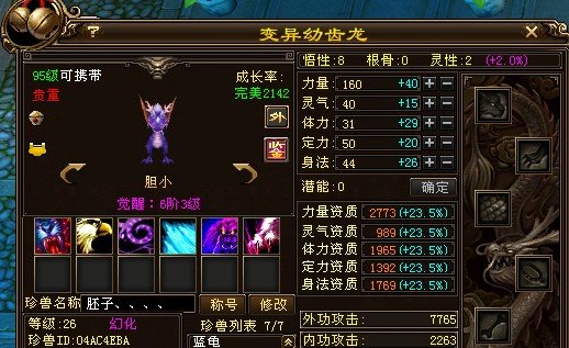 这个BB还是做附体划得来。外攻的胆小BB技能不怎么好弄, 而且你这个BB资质和成长都不错, 要弄攻击宝宝最好还是弄内功的,