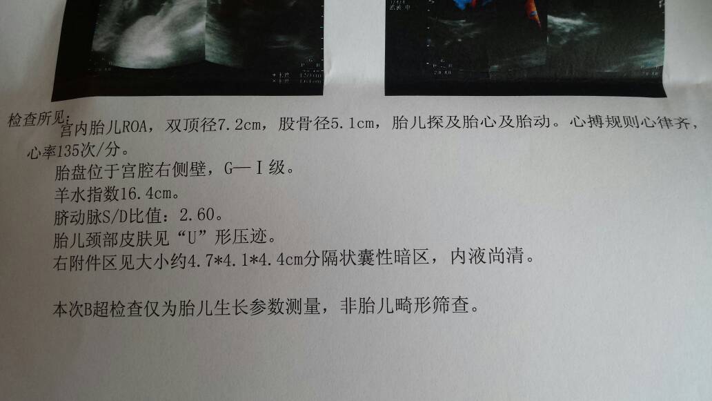 哪位朋友帮忙看看,今天刚做的B超,分析一下 哪位朋友帮忙看看,今天刚做的B超,分析一下 点击展开 无名有姓 2014-07-17 16:13 为您推荐: 其他回答 从B超结果上看一切正常,胎位正常,胎心率正常,没有脐带绕颈。好象有卵巢囊肿,如果你没有不适感觉就没事。 ok天秤座10 2014-07-17 17:08 相关问题 请懂的朋友帮我分析一下这张怀孕七个月的B超报告单! 我今天做了b超,挺好的,十二周左右,可医生让我明天空复去检查细胞分析,尿分析,干功能,乙肝,等等!