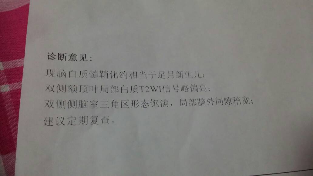 现脑白质髓鞘化约相当于足月新生儿,双侧额顶叶局部白质T2W1信号略偏高,双侧侧脑室三角区形态饱满 现脑白质髓鞘化约相当于足月新生儿,双侧额顶叶局部白质T2W1信号略偏高,双侧侧脑室三角区形态饱满,局部脑外间隙稍宽,这是我孩子三十五天核磁共振结果,请问情况?谢谢 点击展开 阿哲1020 2014-11-26 18:00 为您推荐: 其他回答 定期复查!!!! 保护自己和家人 2014-11-29 20:10 我家也是!!!! 保护自己和家人 2014-11-26 22:06 相关问题 新生儿,做头部MRI平扫:右侧脑室后角旁脑白质异常信号,考虑白质损伤,双侧苍白球T1信号偏高,髓鞘化延迟,两侧小脑半球脑外间隙增宽,这是什么意思呀 神经节苷酯和脑蛋白水解物这两种药物的区别,还有对于新生儿双枕叶脑白质密度略减低哪个效果更好? 小孩磁共振检查结果 双侧脑室旁脑白质异常信号 影像所见双侧脑室旁脑白质显示片状长T1长T2信号影