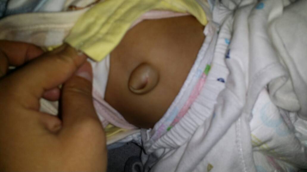 宝宝这是脐疝的,年龄小,腹部肌肉发育不成熟,要是宝宝哭闹,腹部用力等原因可出现的,目前可先用一元硬币压住,平时注意喂养,避免宝宝哭闹,用力,随着年龄发育,腹部肌肉成熟可自行长好的。
