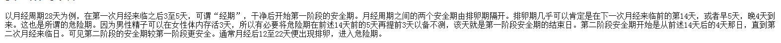 女性安全期怎么计算?安全期计算器是那么看的? 绿色的是安全期哦,那么下面文字说的精子可在女性里存活3天,日期里面绿色的是排除了那三天的吗还是什么?日期里面哪几天是安全的啊(绿色里面的)或是都安全 点击展开 匿名用户 2014-07-15 15:19 为您推荐: 其他回答 前7后8 月经前7天,和月经后8天。 匿名用户 2014-07-15 15:42 相关问题 女性安全期计算器,女性安全期是什么时候,女性安全期自测 怎样计算女性安全期,我跟我女友是这月十六号到十八号做的,她这月应该二十号来,可是到今天她还没有感… 女性安全期计算测试 怎么输入都是错误的时间,我上个月就是2011年01月21日来的 可是怎么输入都说要我输入