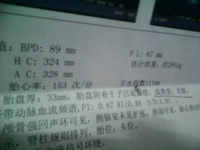 36周 今天做的B超 有宝妈知道我的宝贝有多少斤吗 36周 今天做的B超 有宝妈知道我的宝贝有多少斤吗 点击展开 `外围 .. 2014-12-28 21:14 为您推荐: 其他回答 你好,看报告提示胎儿的体重大概是在5斤半左右的,接近足月了,按时产检啊,祝你生个健康的宝贝。 文斯6 2014-12-28 23:13 五斤多吧!!! 浮化的黺底攃出誰锝妝 2014-12-28 22:46 下载孕妈助手这个软件,里面有算宝宝体重的 萌萌哒_pBE7 2014-12-28 22:06 五斤多,,, 你与时光皆薄情 2014-12-28 21:50 5斤半多哦 green apple 2014-12-28 21:37 加载更多 相关问题 今天36周+6天,这是今天做的B超单 请问宝宝体重大概多少啊?怎么算 为什么34周做b超说我胎位正着呢?今天去做b超就说我胎位不正了?什么时候才把胎位定好呢i?好担心宝 今天去查B超,医生说胎儿头小了,双顶径才83mm,我现在36周+2天,那个头小会怎么样,如何使头长
