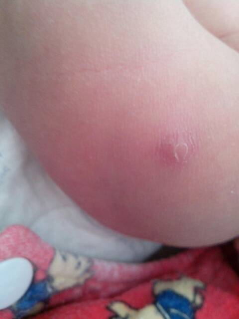 不要担心的,你的宝宝手臂的情况是正常的,这个是正常的卡介苗接种后的免疫反应的,免疫接种卡上面有说明的,这个地方不要搓洗,不要用酒精或者其他消毒的液体擦,如果有溃烂的话保持干燥等待自行结痂即可,自己会好的。