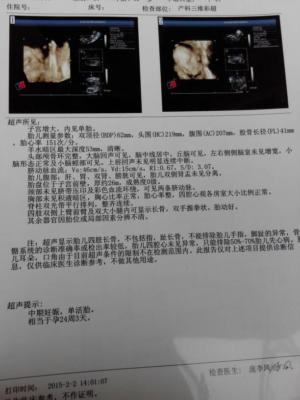 今天的三维,有经验的宝妈都来看下,其实男女无所谓,不过还是挺好奇的 今天的三维,有经验的宝妈都来看下,其实男女无所谓,不过还是挺好奇的。 点击展开 一米阳光_ 2015-02-02 17:38 为您推荐: 其他回答 像谁不重要 只要宝宝健康就好 对不起 只是忽然很想你 2015-02-02 20:22 你好,这样的结果是不能确定胎儿的性别的,由于国家不允许,所以在所有的检查单中都是不会有相应的结果的。 群岛舟山 2015-02-02 18:50 像女宝宝…… 小小李他妈…… 2015-02-02 18:38 好清楚呀,我当时二维呢 落落西 2015-02-02 18:10 是女孩,, 对不起 只是忽然很想你 2015-02-02 17:45 加载更多 相关问题 从三维单可以看出男女吗?有经验的宝妈帮忙看看,挺好奇的 7个月大不?我感觉好大 猜猜是男还是女,其实我也不知道,好奇心大,不过男女都无所谓' 有没有做过三维宝妈?今天去医院检查医生说还要做三维,可是之前听都没有听说过,宝妈们你们知道吗?