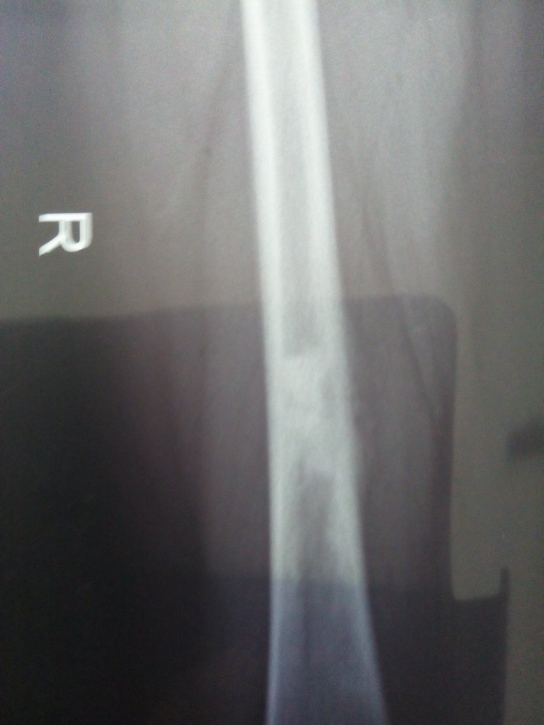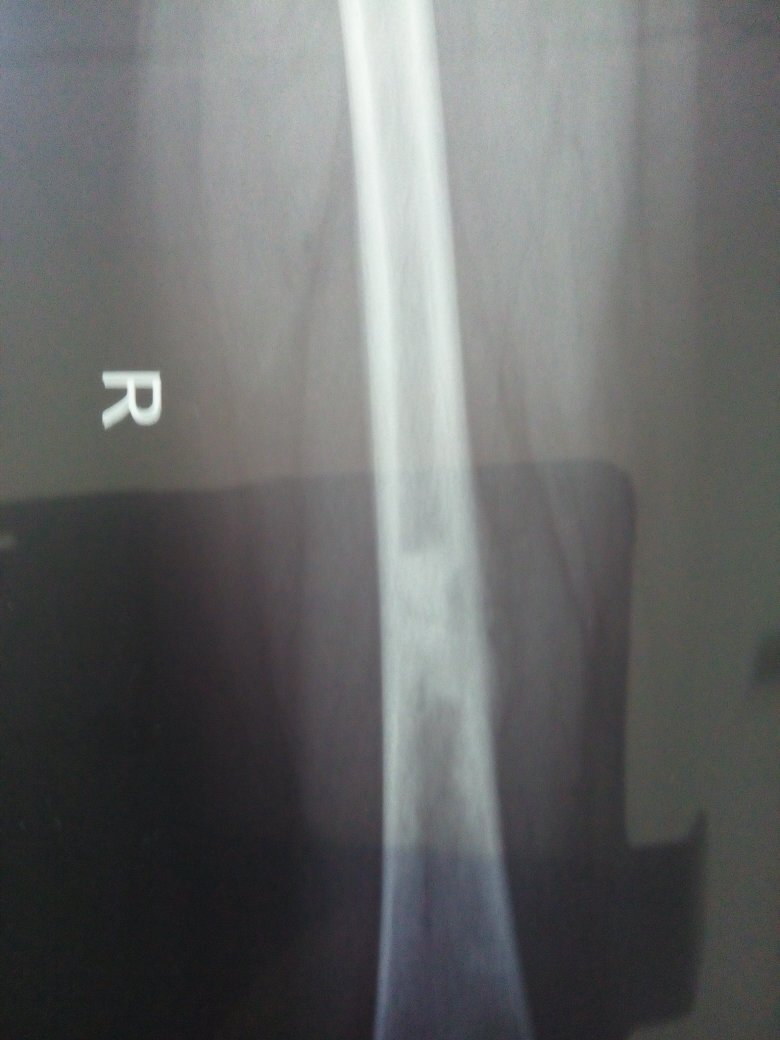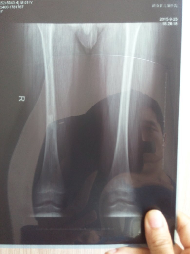 小孩因为髋关节滑膜炎住院8天,髋部疼痛有反复 遂出院去省儿医门诊,拍股骨时发现中段有阴影 又返回地