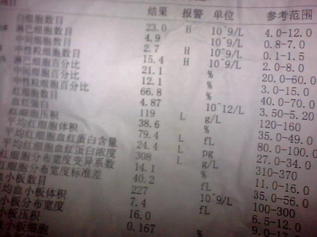 血常规一三分类 四岁小孩发烧,查这些代表什么啊? 点击展开 毕凡儿_06JM 2014-02-28 22:34 满意回答 你好,主要昌截是看看宝宝是不是有炎最串葵症,这是最关键的。如果发炎了要消顿洞炎。 牧智渊_SGBh 2014-02-28 22:52 宝宝知道提示您:回答为网友贡献,仅供参考。 相关问题 血常规+白细胞异常分类出现异常指标 血常规+白细胞异常分类出现异常指标 血常规(三分类)检查结果: 白细胞计数(WBC