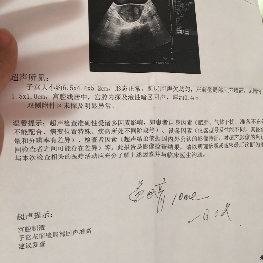 三个月引产清宫后第十三天复查 左前壁回声增高 范围1.5乘1.0cm 宫腔内探及液性暗区 厚约0 点击展开 匿名用户 2016-10-17 10:15 满意回答 怀孕三个月引产清宫术后复查细印B超宫腔内淤血可以口服益母草或者新报径呈生化颗粒试试队崇 cn#aVfLaQLVpf 2016-10-17 10:16 宝宝知道提示您:回答为网友贡献,仅供参考。 相关问题 引产清宫十二天后彩超显示子宫体大小7 6*6 9*4 9宫腔内探及4 0*1 0cm不均质回声区 三个半月引产清宫后,第一次月经十天未净,现在还有血,B超查的宫腔内有积血,医生开的独一味分散片和四 引产玩做宫颈糜烂手术 15天后B超宫腔积液 可以清宫吗