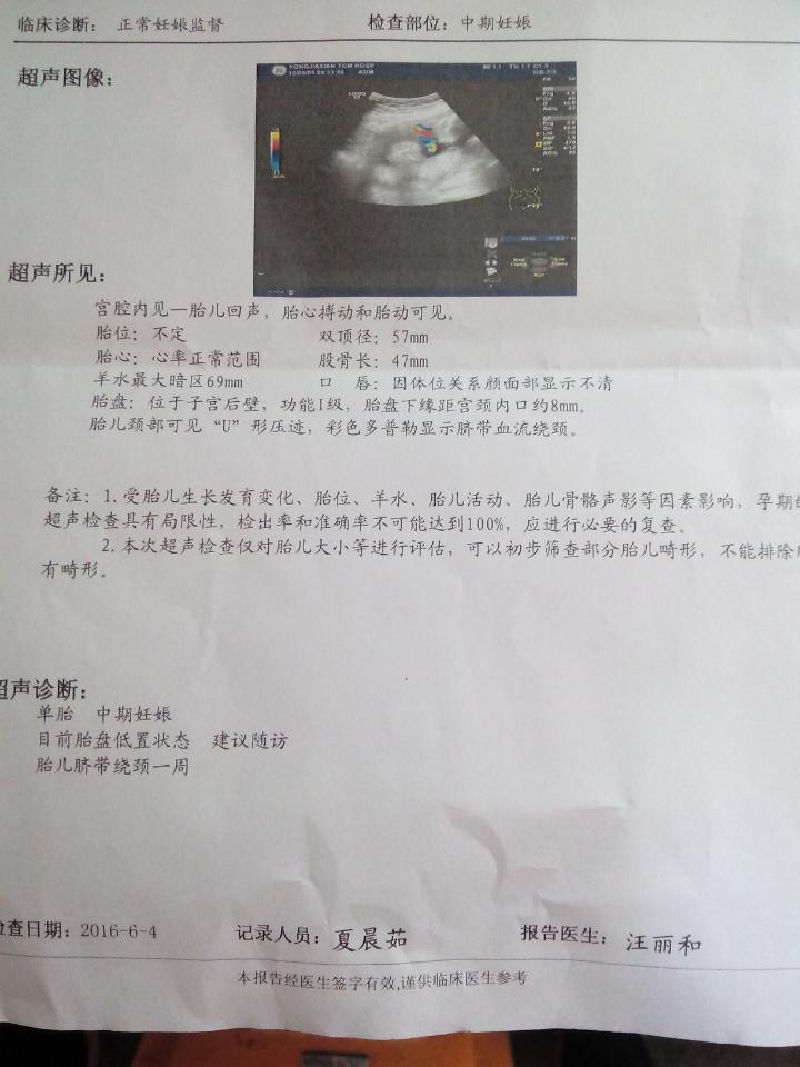 今天去做孕中期彩超,妇产科医生不在,有谁会看B超单的帮我看一下,医生说胎盘太低了,胎儿脐带绕颈一周 今天去做孕中期彩超,妇产科医生不在,有谁会看B超单的帮我看一下,医生说胎盘太低了,胎儿脐带绕颈一周,怀孕24周,怎么办?有点担心 点击展开 二宝宝贝@ 2016-06-04 10:10 为您推荐: 其他回答 没事的正常现象 曼溶 2016-06-04 10:22 不清楚,, 滕子涵 2016-06-04 10:21 祝你好孕, @安妮1993 2016-06-04 10:20 多卧床休息,不要运动 熊熊宝贝00 2016-06-04 10:19 后期宝宝自动就绕回来了 far away 2016-06-04 10:19 加载更多 相关问题 还想等做三维,可惜,我这里刚打电话问我姐了,她是妇产科医生说都不做三维了,只有彩超和普通b超,伤心 b超检查医生说胎盘成熟2+了!胎儿头也入盆了!预产期是27号!而且今晚肚子痛的厉害!当然不是很规律 孕24周B超:双顶径5 5CM,股骨4 2CM,肱骨3 7CM,胎盘下缘距宫内口3CM,胎儿颈部可见一组脐带血流正常吗?