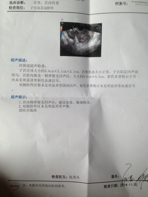 这是宫内孕吗阴道超声检查:子宫宫体大小约5.6×5.1×5.1cm,宫体形态大小正常,子宫肌层回