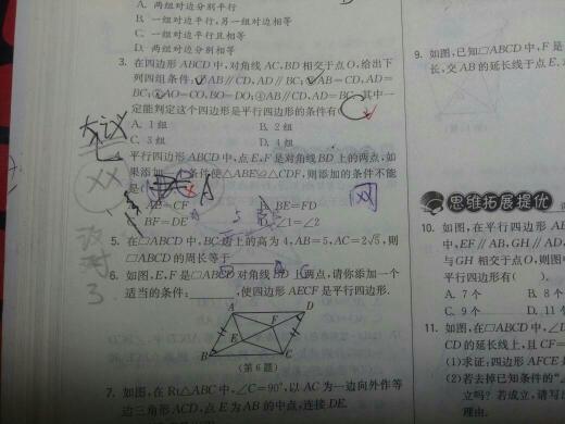 考点是全等三角形的判定,这个书上很详细,百度一下也能找到 B和C都是SAS(边角边),即两条边对应相等,两条边的夹角也相等,那么这俩个三角形全等 选项A是常见的错误选项,就是说:两个边相等了,也有个角相等,那么这两个抗间生三角形不一定是全等的,那个角必须是夹角的时候才全等! D选项不知所谓啊,下面的图抹抹是第6题的,可是我也没看到第4题的图。这是印刷错误吧。另一方面,如果两个三角形中有两个角相等,有一条边也相等,那么这俩个三角形是全等的 (通常的定理是两个角相等,两个角的夹边也相等,那么这两个三角形全等,但是三角形内角和是180°是恒定的,只要有两个角相等,那么三个角都相等,那条相等的边无论如何也能算“夹边”) 再补充一下,C选项,BF=DE,这个。。。。要注意,BF=BE+EF,DE=DF+EF 那不就是BE+EF=DF+EF吗。。不就是BE=DF吗吉肿,就是B选项,还是边角边定理