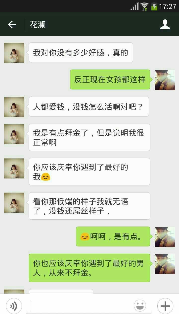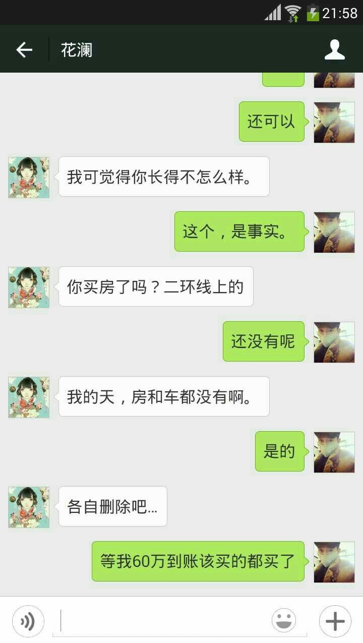 哥们儿你真好脾气 这样的sb应该直接骂她 你问她是处女么 搞过几个男朋友 凭他么什么要你拿钱欺慕拿房拿车跟她个N手货搞对象 你就应该回她老子要是有钱早找处女惠满狼了 就因为没钱没房没车才跟你这搂源么个你手货浪费时间 钱特么没有能挣