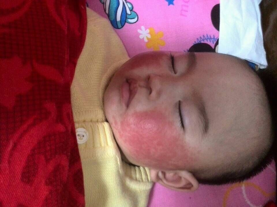 真可怜的宝贝,看着像过敏反应。如果是急性出疹,应该是全身性的,不会只在脸蛋上。