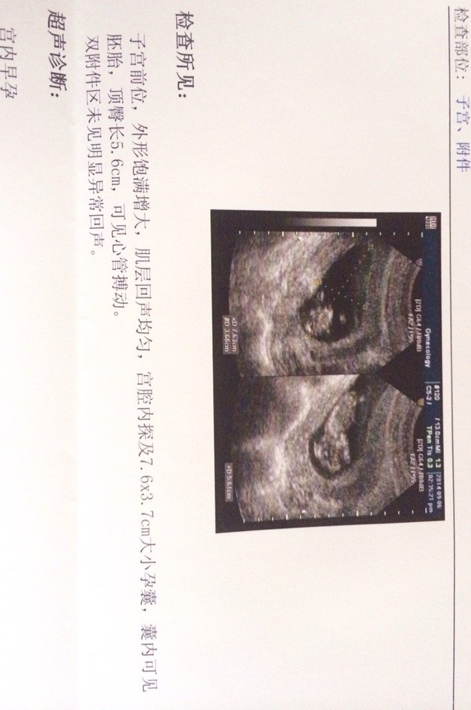 从此次b超检查结果看,是正常的宫内孕。胚胎已初具人形,按头臀长5.6cm推算,孕周月12周左右。建议注意孕期保健,定期产检。