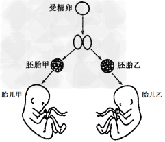 甲和乙为同卵双胞胎,其发育过程示意图如下,下列说法不正确的是 [ ] A.幼小的胚胎在发育过程中不会发生细胞的凋亡B.甲患某种常染色体显性遗传病,乙正常,则可能是甲胚胎发生了基因突变C.甲和乙在表现型上的差异主要是由基因重组导致的D.若母亲为伴X显性遗传病患者,胎儿为男性时,需要对胎儿进行基因检测