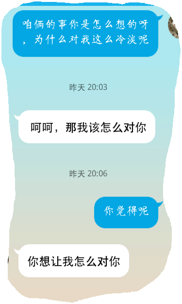 亲,我曾这样对待过一个男生,他和你很像,其实男的没问题是女人的问题,第一他不爱你,你总缠着他,她已经对你爱理不理,不耐烦了,第二,不爱你也不和你说明就是这样吊着 你,是不想和你闹得太僵,如果以后心情不好,还可以回头看看你这个垃圾桶,亲,放手吧,他不适合你,找个珍惜你的,你会比现在开心很多
