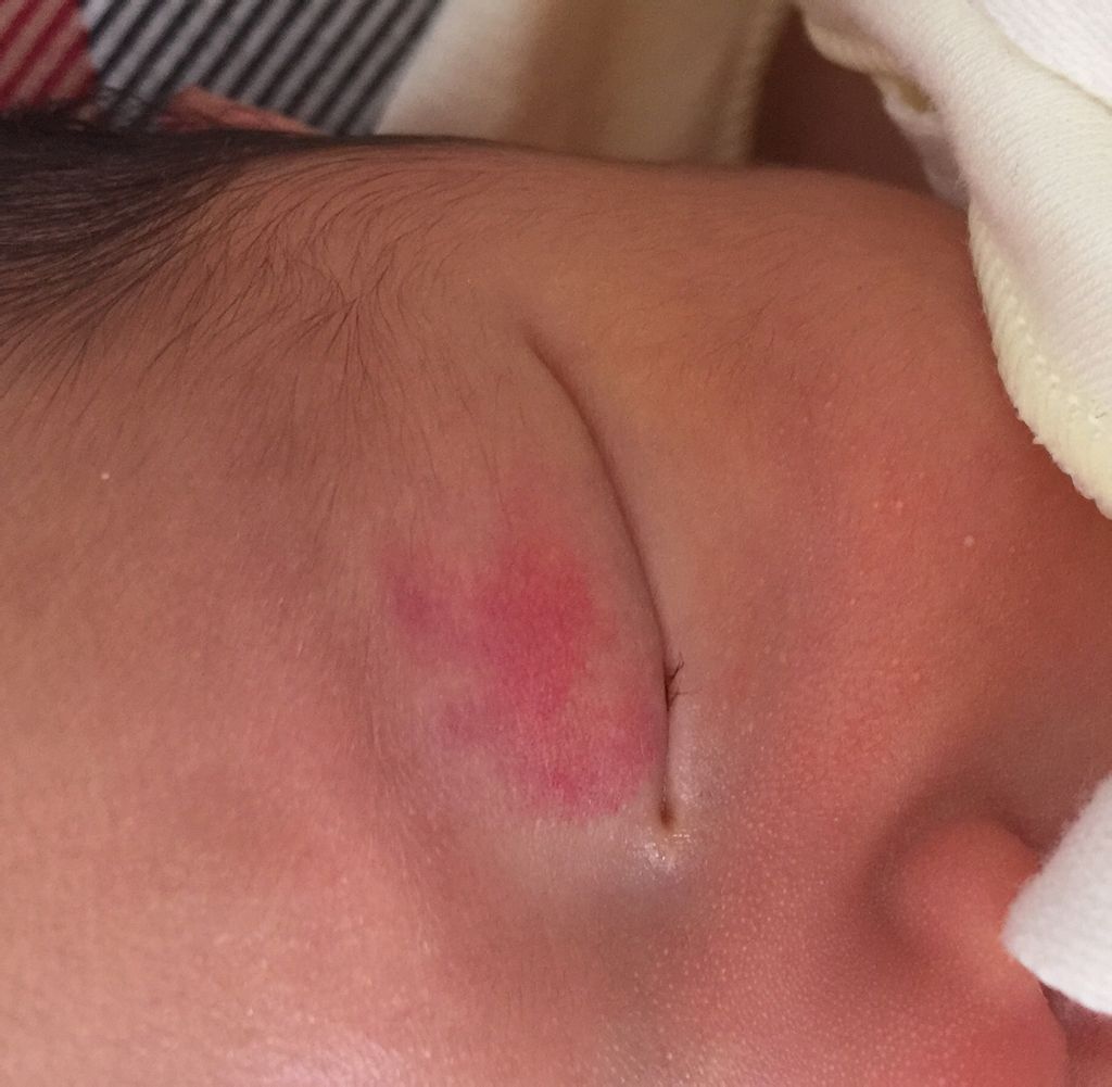 根据图片分析 考虑是鲜红斑痣目前孩子还太小 建议暂时观察面积和颜色的变化 等满三个月后就可以进行治疗了