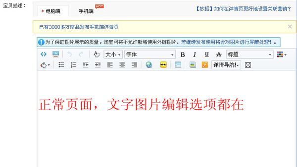 淘宝宝贝详情无法编辑怎么办 没有这个界面,只有一条灰色的杠,求大神帮忙,急!!!在线等!!! 点击展开 匿名用户 2014-11-23 21:51 推荐回答 刷新一称浅下,或者关掉重启一下。如果还不团荒行就用360清理安涌祸一下网络缓存。 匿名用户 2014-11-23 21:58 宝宝知道提示您:回答为网友贡献,仅供参考。 相关问题 淘宝宝贝分类无法编辑 有没有一款专业编辑淘宝宝贝图片的软件求推荐 淘宝宝贝描述显示不出来怎么办啊?大家都是怎么编辑比较方便啊?