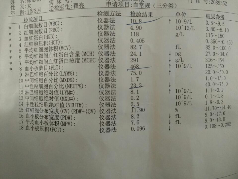 之前孩子发热,咳嗽,感冒。在市级的妇儿医院检查说是支气管炎,给开了6天的点滴。药用的是青霉素和喜炎平,一天一次,一次两瓶。今天正是第6天,之后又检验的血常规,医生看后说还没好,得换其他药再挂。我家孩子才15个多月,总是这么挂点滴也不见好,也不知道该怎么办了,麻烦专家给看看是否还需要继续挂点滴,还是吃点药就可以了呢?下付今天的血常规化验单。