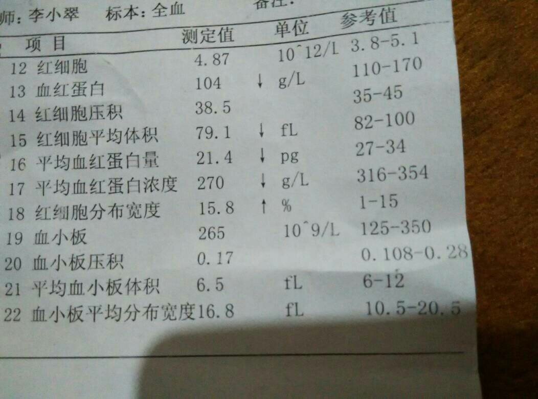 贫血但不是月经造成的 下面这是化验单 能帮我看看主要原因吗?好对症下药 点击展开 匿名用户 2016-02-21 18:56 满意回答 你好,小细胞低色素性贫血常是缺铁引起,建议进一步件露检查一下贫血香相筛揭命舞查。 cn#akBBfGBpQu 2016-02-21 18:58 宝宝知道提示您:回答为网友贡献,仅供参考。 相关问题 怎样判断婴儿是否贫血? 先检查是什么类型的贫血再对症下药吧 我的宝宝3个多月了,医生说贫血挺严重的,我看不懂化验单,麻烦帮我看看,再有什么补救的办法,谢谢了 我家宝宝的10个月,请专业人士帮我看看我家宝宝的血常规化验单,看看是为什么贫血