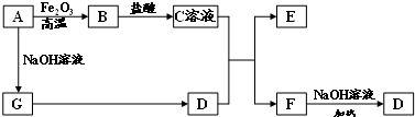 D是能使湿润的红色石蕊试纸变蓝色的气体,则D为NH3,其中A、G为单质,且A与氧化铁反应,与氢氧化钠反应反应得到G,G反应可以得到氨气,可推知A为Al、G为H2,E、F均能与NaOH溶液反应,结合转化关系可知,故B为Al2O3,C为AlCl3,E为Al(OH)3,F为NH4Cl,(1)F为NH4Cl...,电子式为:,故答案为:;(2)