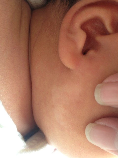 请各位帮忙看看,女儿这脸上是什么?出生时没发现啊,好像这两天才有的,是白癜风吗?