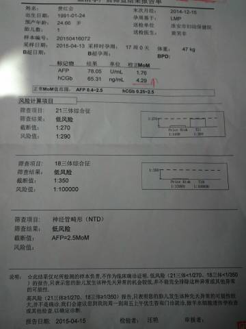 医生帮我看看唐氏有没有问题好多人说唐氏不准 医生帮我看看唐氏有没有问题好多人说唐氏不准 点击展开 天使的诱惑_2gMa 2015-04-17 18:47 为您推荐: 其他回答 你好,根据你的报告单,考虑是低风险情况,建议20-24周去做个三维排畸彩超检查。 llf455021455 2015-04-17 21:31 没事的,,, dai两熊孩子 2015-04-17 19:26 没事的,, 我真的好孤单 2015-04-17 18:57 都是低风险没事的! 咫尺天涯_CVa0 2015-04-17 18:56 。。。。。。。 妈妈爱大宁宝宝。 2015-04-17 18:49 相关问题 帮我看看这个是不是唐氏筛查的,求医生 怀孕22周+4天了上个月24号去检查医生说唐氏检查不能做了只做了一下b超请问什么时候可以去做四维检 都说唐筛不准,如果我查了不准又要自己掏腰包做穿刺,这不是医院在坑钱嘛?感觉特没有安全感,好多人被医
