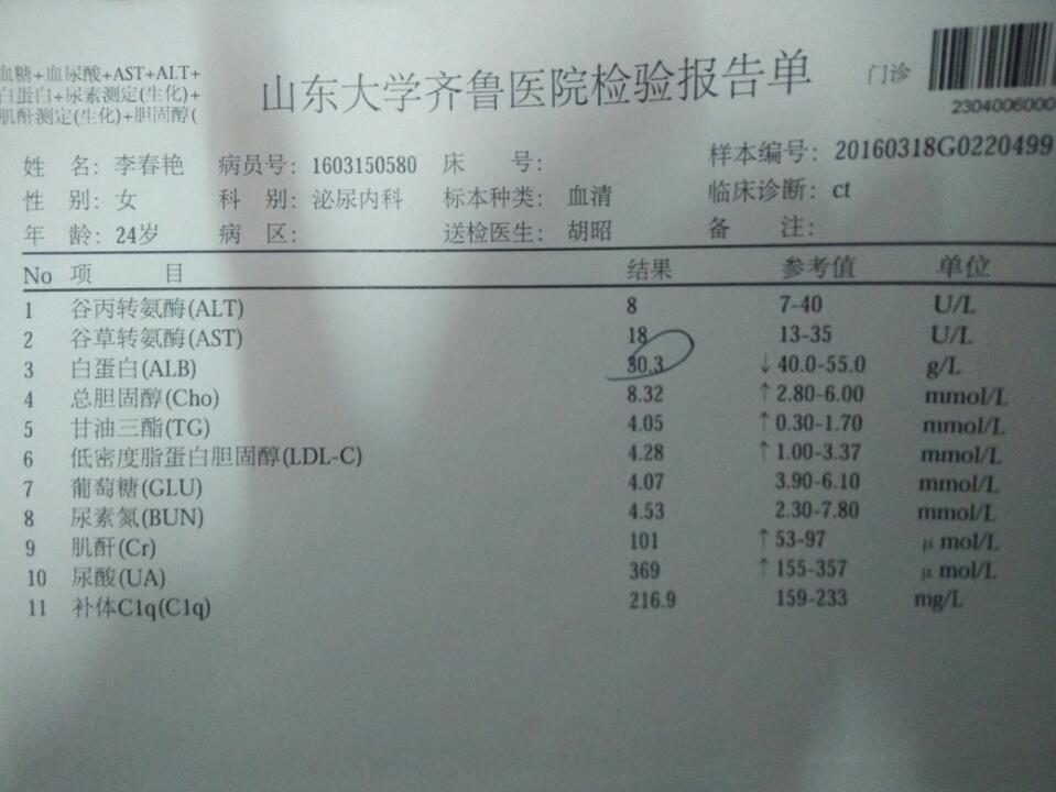 怀孕五个月的时候,查出来尿蛋白3+ 七个月时候去查肾,医生说是肾病综合症,而且肌酐尿素偏高,说 怀孕五个月的时候,查出来尿蛋白3+ 七个月时候去查肾,医生说是肾病综合症,而且肌酐尿素偏高,说明肾已经在受损,白蛋白30正常值是40到55,我该怎么办?治肾的医院要我剖腹产,然后做完月子才肯接受我,等孩子足月还需要35天,做完月子需要一个月,加起来还需要两个月,这两个月,我的白蛋白能坚持到那个时候吗?我的肌酐尿素会增加到什么程度? 点击展开 李春艳。 2016-03-29 19:45 为您推荐: 其他回答 不知道!! 繁华落尽 谁许我一世承诺 2016-03-29 21:14 尿蛋白多喝水啊,说不定就会没了 愿宝宝安好 2016-03-29 21:09 问问医生吧 baby小豪 2016-03-29 21:06 没事的!!? 人生_IomQ 2016-03-29 20:52 问问医生! 136*****936_uQWF 2016-03-29 20:43 加载更多 相关问题 肾穿检查为狼疮性肾病综合症尿蛋白3+掉头发… 小儿肾功能检验结果如下:尿素:4 2,肌酐:22 0,尿酸:252,胱抑素C:1 46,碳酸氢酸: 肾实质损坏,肌酐680,尿素25,这样能喝羊奶粉吗?