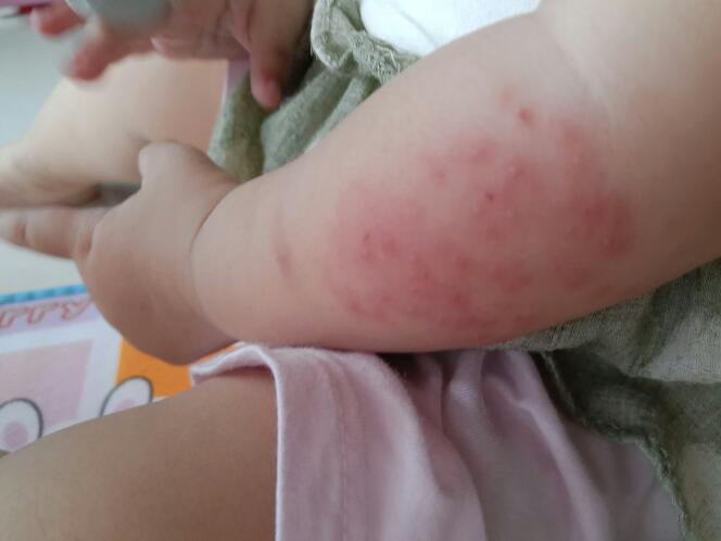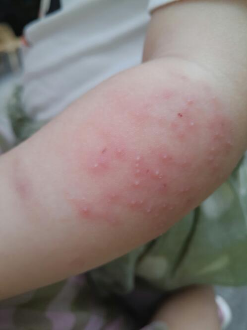宝宝前一天睡觉时手臂上被蚊子咬了一下,醒来发现3个包,涂了花露水和止痒药,第二天发现手臂成这样了