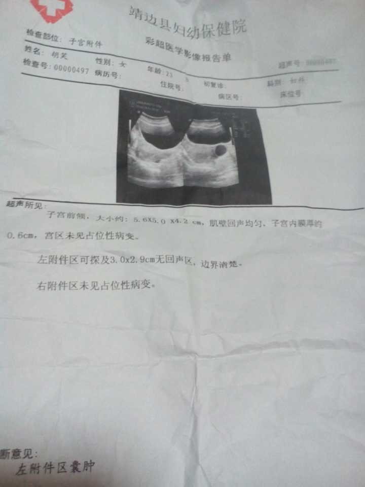 病情分析: 你好,根据b超检测单看你子宫是正常的,但是左侧附件内有囊肿,可能是生理性的,此时处于排卵期内是容易产生黄体囊肿的情况。 指导意见: 对于你的情况最好暂时观察看,可以在月经干净后再进行b超检测看附件区内囊肿是否还存在,如果还存在的话可以服用桂枝茯苓丸,金刚藤胶囊治疗。