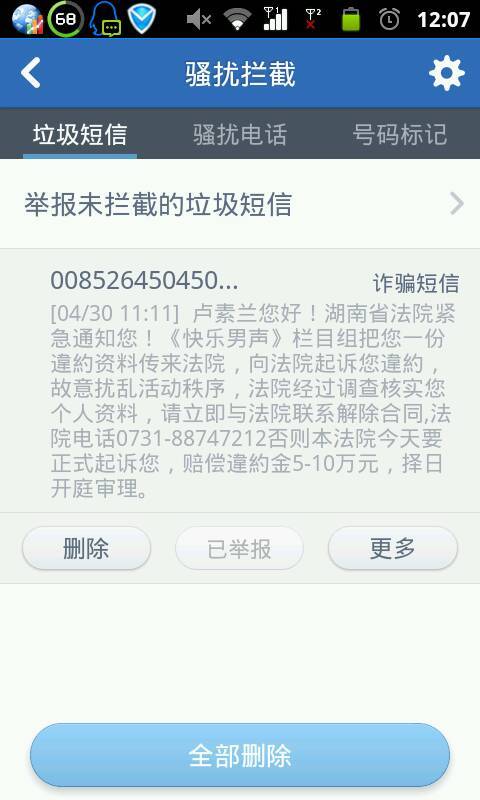 骗虏满子手法高 无处不在!你和我的遇挤搂到的一样,都是用了一些最近较火的电视节目名来引诱人,我之前也填了个在微博上的表,也是诈骗的,随后我一要看看这用户结果改名了不在,。后来的几天里一直来貌吊乐电话骚扰我,还和你一样发了短信说要把我告。。。反正以后遇到这种事不要掉以轻心!切记!