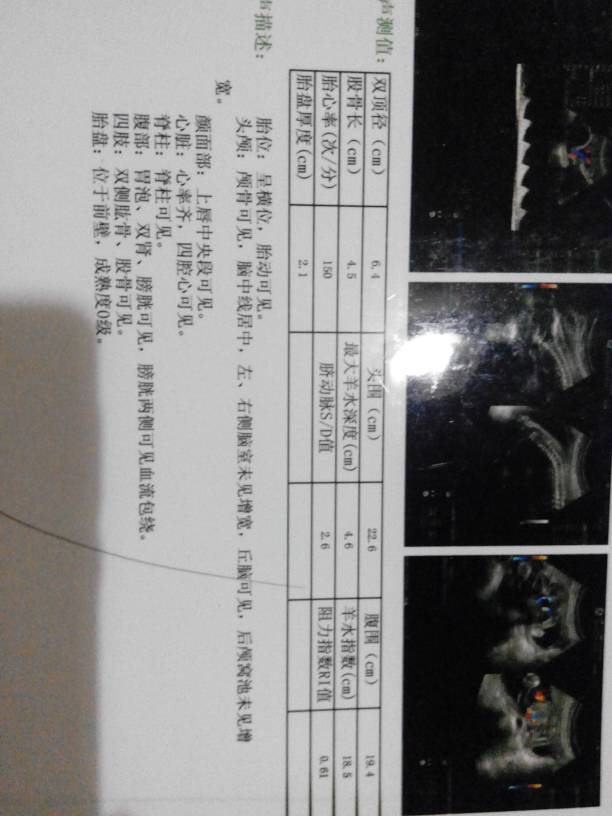医生帮我看看,这彩超差不多是多少周的孕期,我怀疑我的月经记错了 医生帮我看看,这彩超差不多是多少周的孕期,我怀疑我的月经记错了 点击展开 「後来」、 2014-09-05 20:42 为您推荐: 其他回答 按胎儿双顶径和股骨长,腹围数据推算,宝宝发育符合孕24周的表现;所以,应该在孕24周左右。 wzlzx520 2014-09-05 21:08 相关问题 我上个月去做三维彩超,医生说宝宝偏大了两周,医生问我是不是记错了末次月经的日期,我是比如上个月28 末次月经是2014年阳历10月15,到今天怀孕几个月了?做完彩超,医生说不到3个月,没有三个月那 我最后一次月经是2014年12月6号来的,2015年1月18号去做彩超医生说怀孕40天了,怎么感觉
