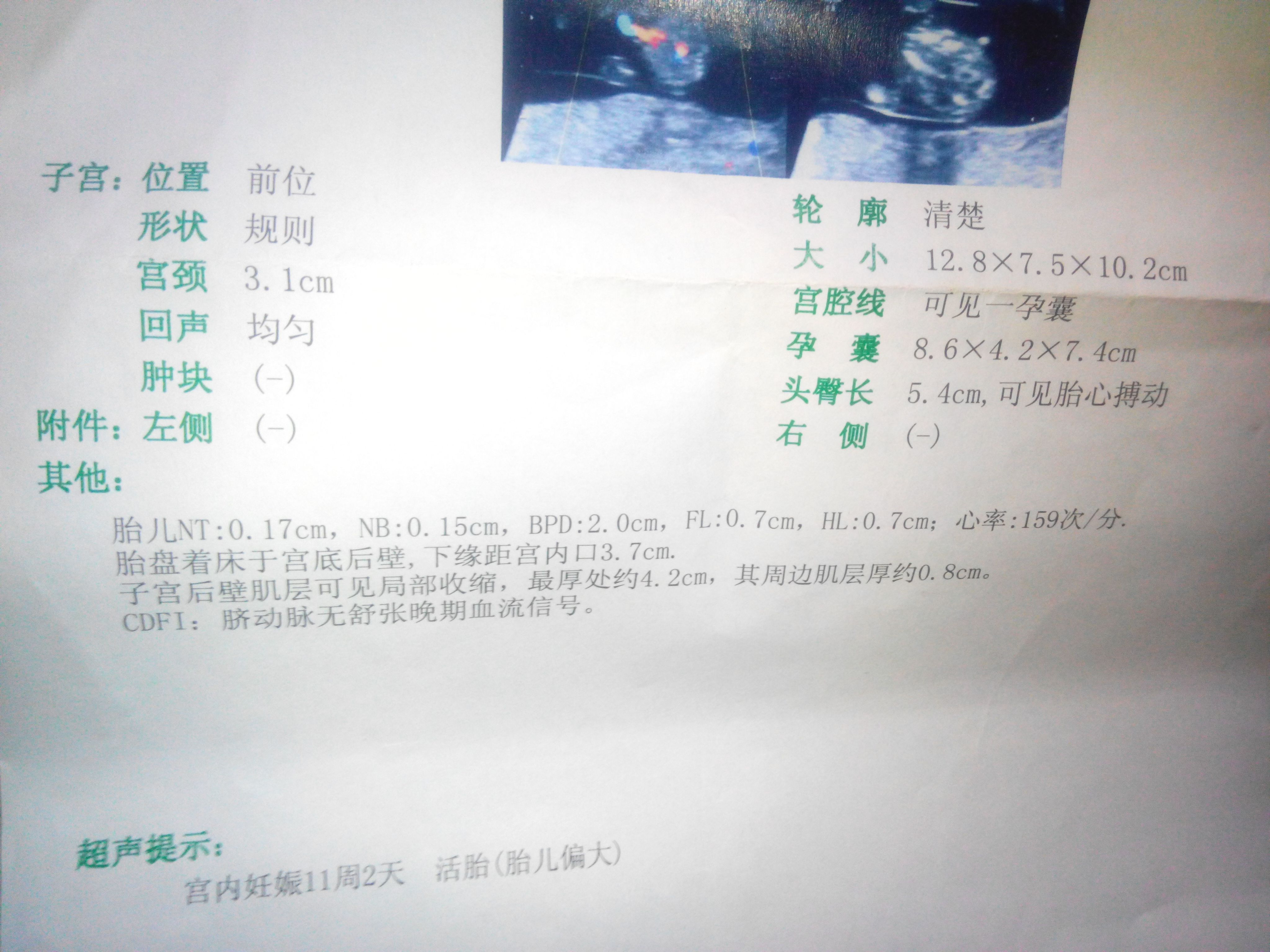 宫内妊娠11周2天 活胎 做B超检查,下成有一条写着CDFI:脐动脉无舒张晚期血流信号 .这是什么回事,严重吗?对胎儿有没有影响。 点击展开 匿名用户 2014-04-22 21:13 为您推荐: 其他回答 病情分析: 你好,这个是没有问题的。 指导意见: 目前的检查结果各项数值基本正常,宝宝是健康的,不用担心。 匿名用户 2014-04-22 21:14 相关问题 怀孕26周B超显示脐动脉血流信号消失,一周后复查还是这样,请问这个宝宝我还能不能要?还是现在提前把 CDFI:胚芽内可见闪烁血流信号 6月24号当天生化妊娠,一周后血流干净B超内膜5mm,7月没来月经,于是是看医院开了逍遥丸和孕姛片
