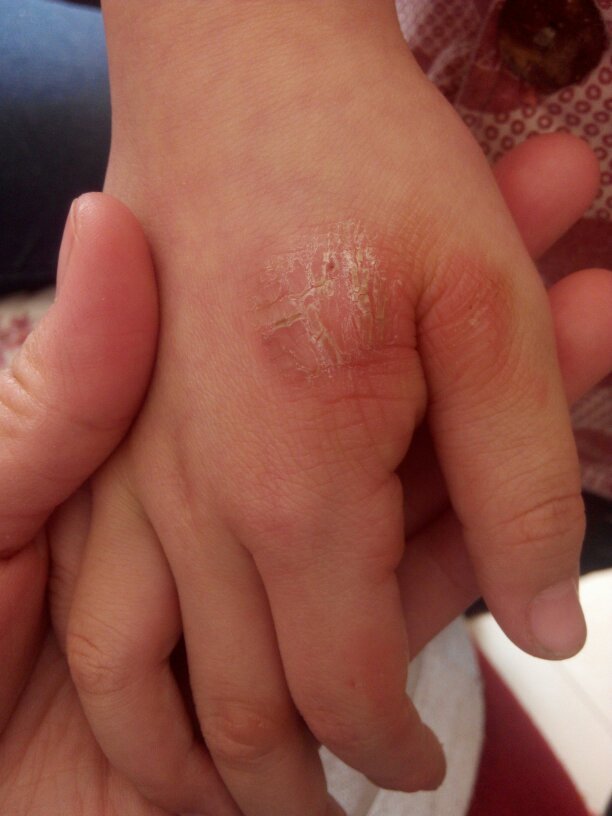 小孩手背虎口处,和手指上起树皮一样的硬皮,从4岁开始起到六岁,抹普通治疗皮肤的药膏不管用,谁知道怎