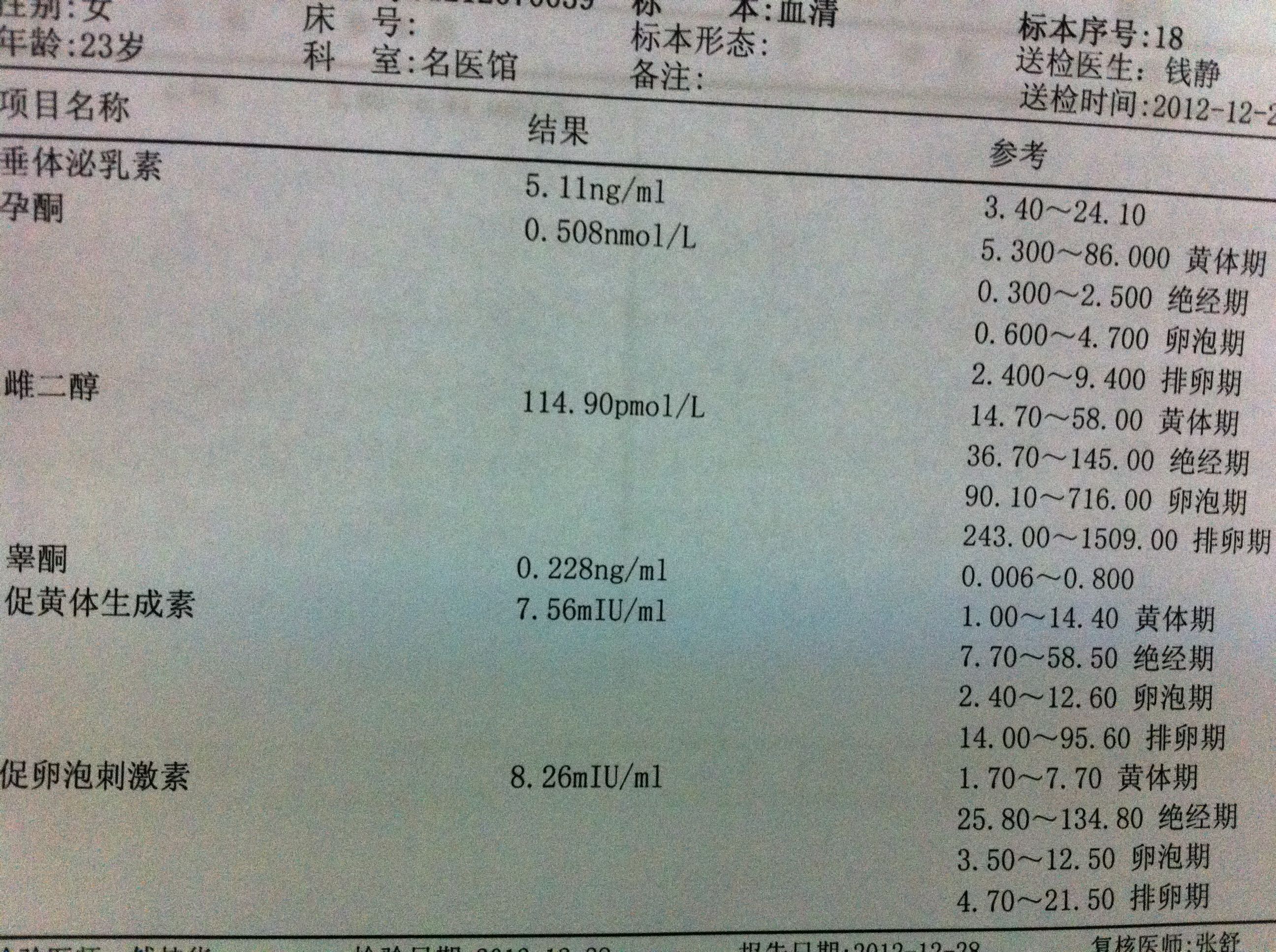 跪求懂医的人帮忙看一下这份报告 月经第三天去做的女性激素六项、先谢谢了 在线等 点击展开 匿名用户 2012-12-28 17:49 为您推荐: 其他回答 全都正常啊!不知你看什么病?是不孕症吗? 濯向晨_Mh0C 2012-12-28 20:18 相关问题 月经第三天去查的激素六项,请懂医人士帮忙看一下 急!请懂医的帮我看看羊水穿刺的FISH的快速结果!是不是就能确定宝宝不是唐氏?下面这份报告能看出性别吗 我媳妇怀孕40多天,昨晚下面轻微出血,今天去做B超,诊断报告单不明白 希望懂医的朋友帮我解答一下