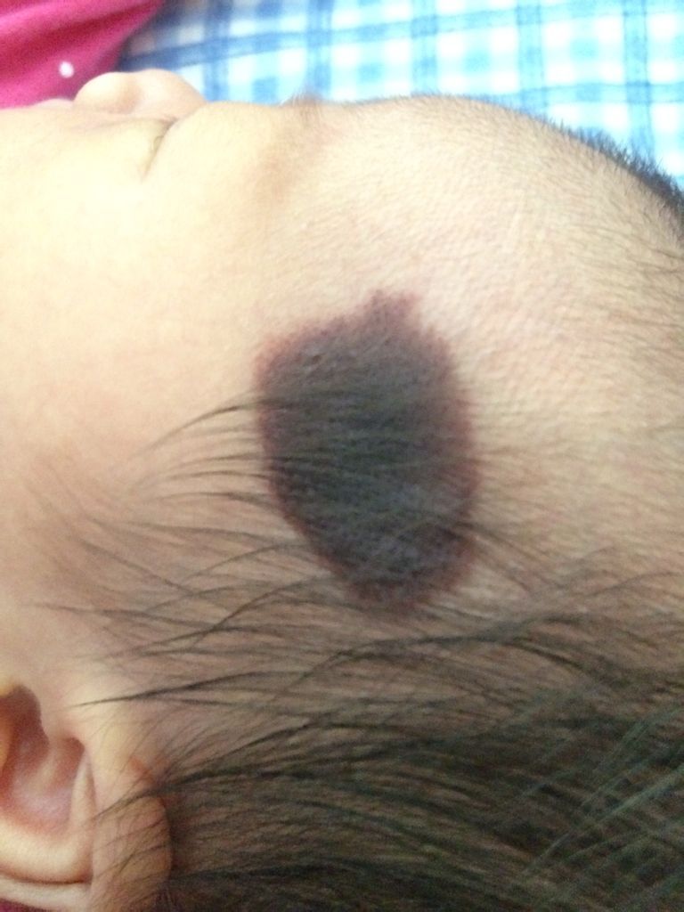 宝宝太阳穴有块胎记,大家帮忙看看是什么,能自己下去吗,如果要治疗需要怎么治疗啊,多大治疗好呢?长在