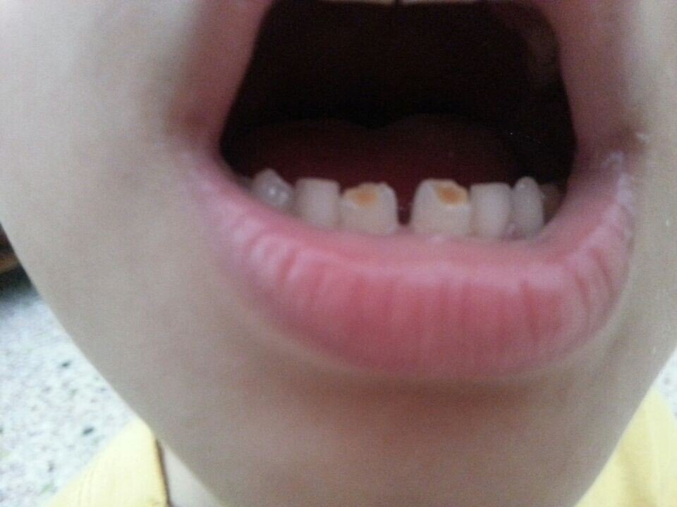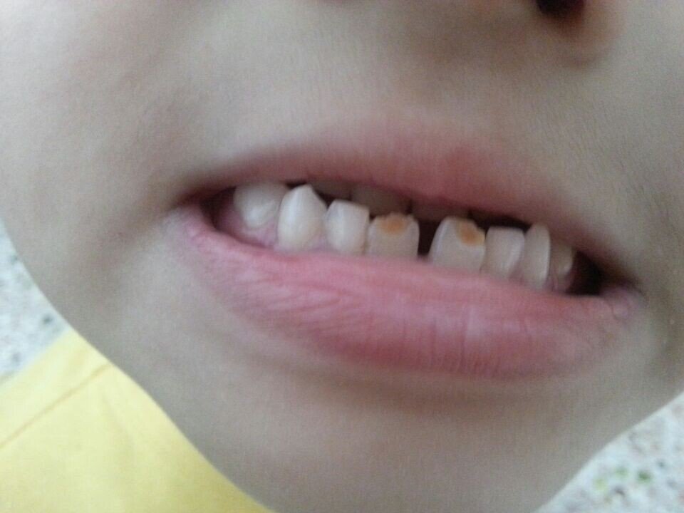 小孩换牙了,怎么会是刚萌出就有有个角是黄色的,去看了牙医他们也说不出来为什么,等长出来些了,下面都是白色,换了两个牙都是这样的, 而且还不齐,以前长的牙都很好的呀,这是什么问题,那黄色的部分是什么? 请各位懂的专业医生支支招!只换了两个,好怕再长出来也是这样的。
