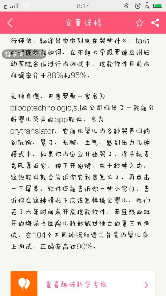 能分析婴儿哭声的软件?有人下载到没,我搜了没有! 能分析婴儿哭声的软件?有人下载到没,我搜了没有! 点击展开 梓淇妈妈1 2015-10-22 08:16 为您推荐: 其他回答 其实宝宝哭了,要不饿了,要不拉便便了,要不换纸尿裤,要不要睡觉,时间久了,你也会知道,不需要什么软件 郁金香_bNWL 2015-10-22 14:05 我没有!!!! 小妤妤 2015-10-22 11:36 没用过,时间长了宝宝想干嘛一眼就能看出来,不需要什么软件! 0静静 2015-10-22 10:38 不知道还没有吧 唐爸程妈 2015-10-22 10:18 没有啊…… 从此以后。 2015-10-22 09:57 加载更多 相关问题 怎么下载快播啊,手机怎么搜不到那软件 婴儿肚子饿的哭声效果音哪里有下载 我要一个软件,是这个 http://tieba baidu com/p/1669944630,百度可以搜到,春风08版宝宝,我需要下载