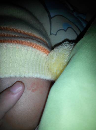 你好,灯光比较暗,看不清楚具体是什么样子 的,就这一个地方有还好,只要不是成片的疙瘩就行,注意观察,别让宝贝自己抓了,一般的痘痘几天就能自己消下去。