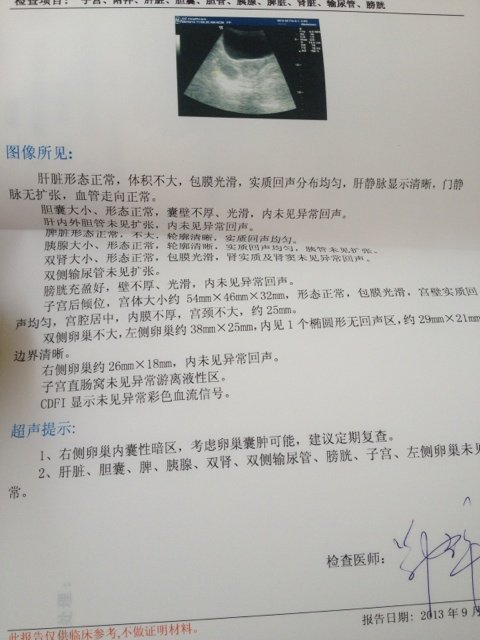 我月经不调,今天去医院检查的B超,哪位大师能看出什么吗 点击展开 匿名用户 2013-09-10 11:20 满意回答 就是卵巢囊肿,要定期复查的,别的都很好! 弘寄瑶_lkwx 2013-09-10 13:52 宝宝知道提示您:回答为网友贡献,仅供参考。 相关问题 这是今天的B超单子,能剖腹产了吗,因为之前月经不调(推后),自己也没办法确定准确的预产期 我以前有时候月经不调!所以我忘了我最后一次月经是什么时候来的了!我只知道是四月份!今天做B超医生也 月经推迟,医院检查尿HCG阴性,B超没发现怀孕,请问是月经不调还是怀孕没检查出来?