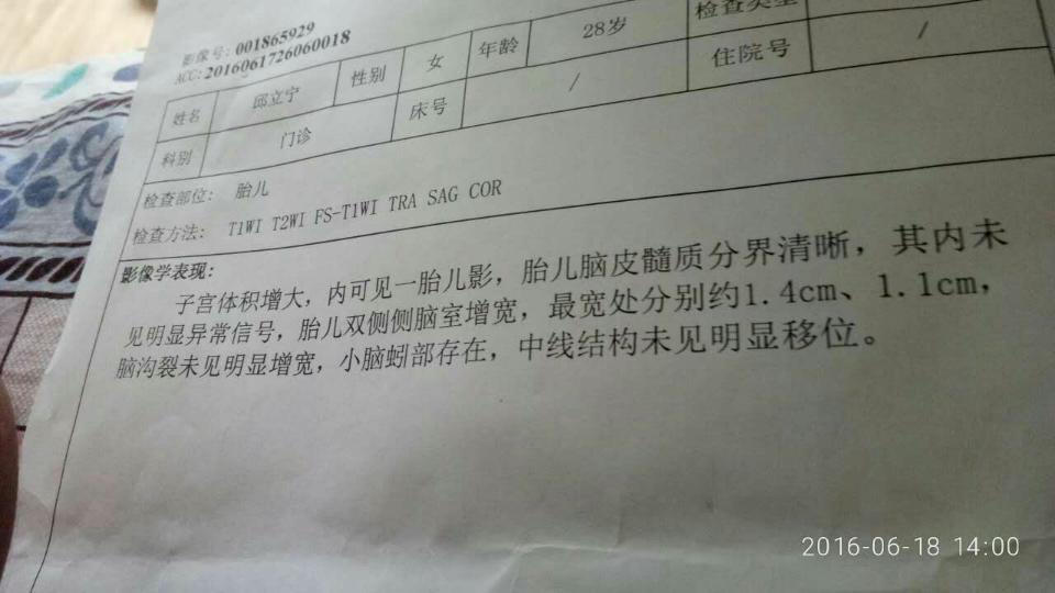 请专家帮忙看看磁共振报告单,我该怎么办? 请专家帮忙看看磁共振报告单,我该怎么办? 点击展开 泥鳅06081320 2016-06-19 06:10 为您推荐: 其他回答 那就继续观察吧, cn#BQBkLQupfp 2016-06-19 09:18 ,,,,,,,,, 毛嘉钰 2016-06-19 08:56 你好,你的资料我看过了,胎儿侧脑室小于1是正常的,小于1.2一般会自行吸收,小于1.5属于轻微的,建议你定期复查,必要时再次行磁共振检查,排除胎儿脊柱裂 cn#BQBkLQupfp 2016-06-19 08:56 不知道⋯⋯⋯ 转角45•的傻笑 2016-06-19 08:56 。。。。。。。 恬恬8888 2016-06-19 07:30 加载更多 相关问题 磁共振报告单,请帮忙看看? 我家宝宝2周岁了,前几天带她去做了大脑磁共振,报告上说她双侧脑室增宽,我该怎么办? 我怀孕37周 做磁共振左脑室宽约1 6cm,请问我该怎么办?