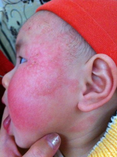 病情分析: 根据照片孩子的情况肯定是湿疹,这个属于一种过敏性疾病,中医认为和上火以及吃得过饱有关。 指导意见: 可以口服扑尔敏等抗过敏的药物进行治疗,如果是母乳喂养大人不能吃上火的食物,如果吃的奶粉应该比说明稍微稀一点。不能吃的过饱,可以少量多餐。