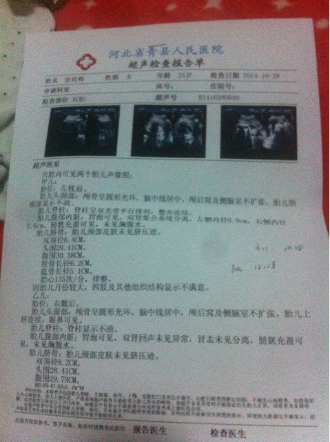 你好,看你的这个检查结果,胎儿大小相当于孕33周多,如果你怀孕时间和这个差不多可以不需要担心,其中一个胎儿肾盂分离的情况因为没有超过一厘米,所以暂时不需要担心,其他数据没有问题