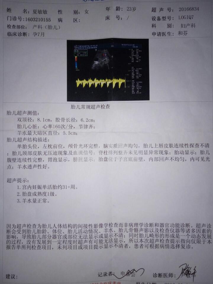医生帮我看看今天刚做的b超单我怀孕31周加了帮我看看什么意思 医生帮我看看今天刚做的b超单我怀孕31周加了帮我看看什么意思 点击展开 叶雨晴 2016-03-26 10:02 为您推荐: 其他回答 我看怎么没什么问题 芯宝宝@ 2016-03-27 19:38 正常。。。。。 134*****348_rjOb 2016-03-27 17:15 问问医生吧 心被你伤“碎了” 2016-03-27 16:28 都很好哦!!!! 150*****211_Nv2X 2016-03-27 16:04 31周了呗,只要检查孩子没事,宝妈就不要担心啦 baby小豪 2016-03-27 15:14 加载更多 相关问题 怀孕10周,今天检查结果这样,医生帮我看看有什么问题吗,谢谢了 怀孕6周,今天去医院做b超,但是医生说只有卵黄囊,没有胎心和胎芽,让10天以后复查,但是这两天身上 今天去做唐氏筛查,医生让我做了个b超,才怀孕16周加3天,已经做了3次b超了,对宝宝有影响吗?