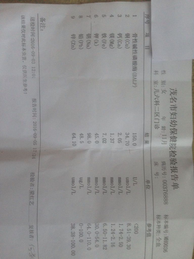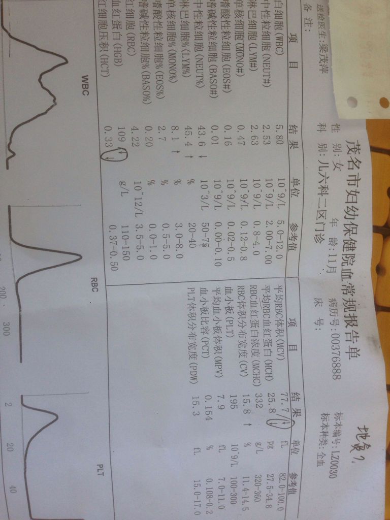 请问,各位对婴儿血常规检查和体检报告有了解的麻烦你告诉一下我的孩子的报告单有什么问题?非常感谢 点击展开 匿名用户 2016-09-06 17:37 满意回答 你好,图片看到了,孩子血常规检查结果,血红蛋白稍微低点,应该是有点缺铁性贫血了。其他检查没有问题荒栋的,不用担心。建议给孩子补劣吊点铁,平时多吃瘦肉,红枣,花生等含铁丰富的食物,观察一个月法们岩再说。 cn#aVVpGfLauB 2016-09-06 17:47 宝宝知道提示您:回答为网友贡献,仅供参考。 相关问题 一岁半男宝宝体检血常规检查报告,请专业人士帮忙看看,非常感谢! 怀孕34周彩超报告单,能帮看一下胎儿有多重吗?非常感谢!! 前几天19周多了,去血常规检查,报告单上写巨细胞病毒Igm抗体阳