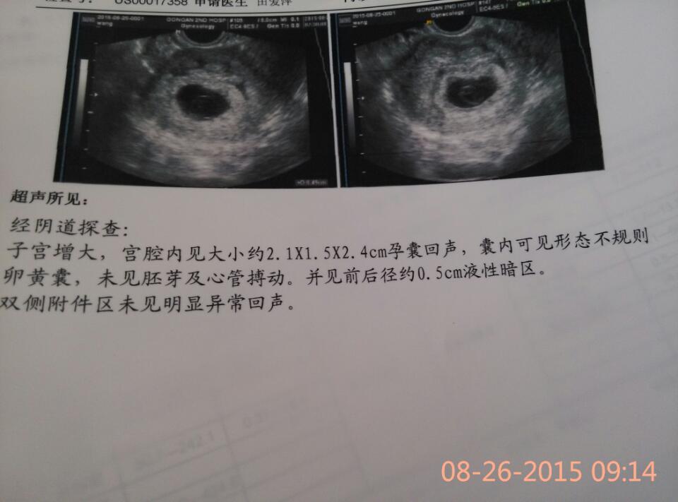 PROG28.08正常吗?4周左右照彩超报告显示:1.子宫切面形态饱满,边界清,轮廓规整,肌层光点 PROG28.08正常吗?4周左右照彩超报告显示:1.子宫切面形态饱满,边界清,轮廓规整,肌层光点分布均匀。2.宫腔内可见2.0×1.5×0.7Cm的孕囊回声,内见卵黄囊显示,未见胚芽及原始心管搏动。3.双侧附件区未见异常回声4.陶氏腔未见液性暗区。提示宫内早孕(如孕4周+、建议复查) 但昨天6周左右去检查超声所见:经阴道探查:子宫增大,宫腔内见大小约2.1×1.5×2.4cm孕囊回声,囊内可见形态不规则卵黄囊,未见胚芽及心管搏动。并见前后径约0.5cm液性暗区。双侧附近未见明显异常回声。超声提示:宫内早孕(约6周+胚胎停止发育)求医生指点。 点击展开 君子如兰。 2015-08-26 09:14 为您推荐: 其他回答 好惨啊,如果停止不可能没流血啊 BaBy秀秀 2015-08-26 16:19 直接问医生 都滚蛋吧! 2015-08-26 13:35 祝宝妈好孕 李奥宝宝! 2015-08-26 13:05 问医生啊! 小zizi 2015-08-26 12:30 不是吧,那医生有没有叫你接下来做什么,我觉得妇保院比普通医院专业点儿 冬瓜麻麻 2015-08-26 12:09 加载更多 相关问题 做彩超显示 膀胱充盈下扫查:子宫呈前位,大小约5 6*5 4*3 8mm,形态规整,边界清晰,肌层 我怀孕11周6天,但阴道出现了咖啡色的东西 有点先兆流产 做了彩超现实是这样的:增大子宫切面内可见3… 做了彩超,上面显示宝宝有十周了,可这个软件上是显示的九周加五天'子宫体上下径109mm前后径72m