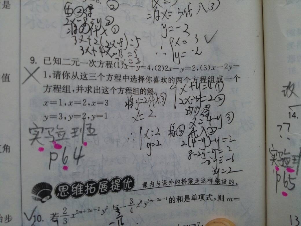 初一数学,实验班P64,第九题我孩子做错了,请大家帮忙讲解一下 谢谢大家 点击展开 匿名用户 2015-05-09 18:08 推荐回答 解题过程没错。唯一岩竞慕一点,就是第一步没有说明,你选哪两震征个,直接写方程组那不算是第一步。先说“我选择查狼1,2这两个方程” 匿名用户 2015-05-09 18:12 宝宝知道提示您:回答为网友贡献,仅供参考。 相关问题 初一数学,实验班,P65,我孩子做错了,请大家帮忙给指点指点,谢谢大家 初一语文,文言文阅读,10,12,13,我孩子做错了,请大家帮忙看看 谢谢 宝宝在学校把试卷做错了 然后自己回来改正的 大家帮忙看看有没有改正错误的