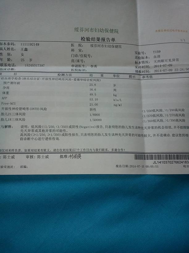 病情分析: 你好,你的唐氏筛查结果是21-三体综合征高风险,唤耀残应进行羊膜穿刺检查或截眠绒毛检查,如果羊膜穿刺检查或绒毛检查结果正常,才可以百分之百的排除唐氏症的可能。进行筛查的最佳时间堡震是怀孕的第15~20周。一般抽血后一周内孕妇即可拿到筛查结果,如结果为高危也不必惊慌,因为还要进一步做羊水穿刺和胎儿染色体检查才能明确诊断。
