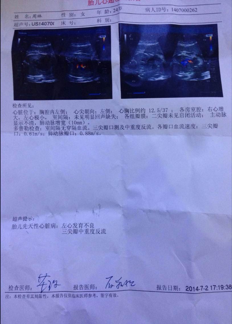 怀孕7个月今天做心脏彩超,说胎儿左心房发育不良,三尖瓣中重度反流! 如图所示,这种情况下胎儿还能要吗?有没有治愈的可能?复制党绕道 点击展开 匿名用户 2014-07-02 19:46 满意回答 说不准,也许可以成功出生,但可能有后遗症,我有一个同学就是这样,心率不能过快,否则立即晕倒惑称。扬抽哑险寸 匿名用户 2014-07-16 17:03 宝宝知道提示您:回答为网友贡献,仅供参考。 相关问题 我怀孕24周做了三维彩超 显示胎儿左心房有两个强光点 医生说可能小孩刚发育没发育好也可能是心脏有问题 我现在怀孕20周多,到下个月去做三维彩超可以看到胎儿手指脚趾了吗 因为怀孕一个多月时见红了两次,到现在三个月为止已经做了5次彩超了,也不知道彩超做多了对胎儿发育有影
