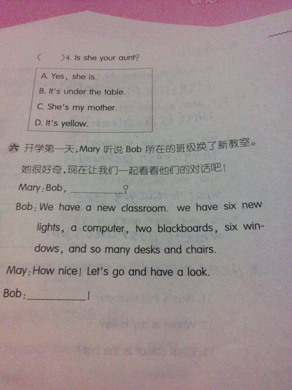 开学第一天,Mary听说Bob所在的班级换了新教室 她很好奇,现在让我们一起看看他们的对话吧! 点击展开 匿名用户 2015-02-03 21:28 满意回答 can you tell me something about your classroom Ok let's go 匿名用户 2015-02-04 10:11 宝宝知道提示您:回答为网友贡献,仅供参考。 相关问题 学校英语艺术节班级表演节目40个孩子7个没有,在教室里,老师和37个孩子嗨皮 班级开学初转来一名同学,名叫罗姬思薇 这个与众不同的名字引起了大家的好奇心 班级一共两个男生下课一起出教室,其中有一个男孩故意等着女孩先出去,女孩却停下来柔声的对男孩说‘走