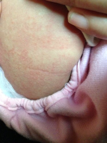 宝妈不要着急,有可能是过敏,尿布皮炎,用布不能用力檫,宝宝皮肤很嫩的,如果破皮的话,就不能用粉哦,建议去医院给医生看看